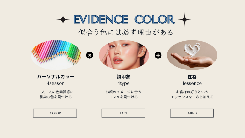 この【COLOR/FACE/MIND】の3つであなたのパーソナルカラーを導いていきます